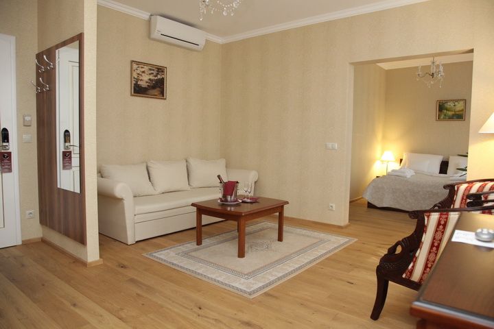 We have 8 suites that can be found on the ground and on the 1st floor. The size of the suites is 38-40m2 where 4 people can be placed. The suits are divided into two areas, a bedroom and a living room where two extra beds can be put.